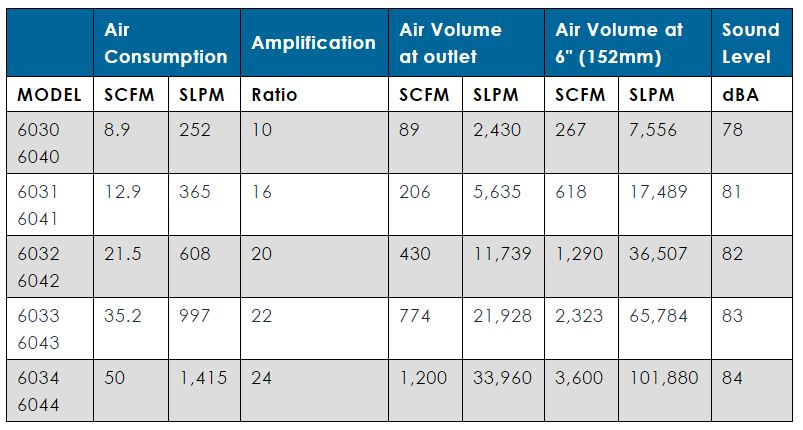 Adjustable Air Amplifiers have good amplification ratios and are very easy to use. The air gap is infinitely adjustable which regulates the consumption and outlet flow from a “breeze” to a “blast”. They are available in aluminium or in stainless steel for food service, higher temperatures (400°F/204°C), and corrosive applications. High Temperature Stainless Steel Air Amplifiers for temperatures up to 700°F (374°C) are available. Please contact Compressed Air Australia.
