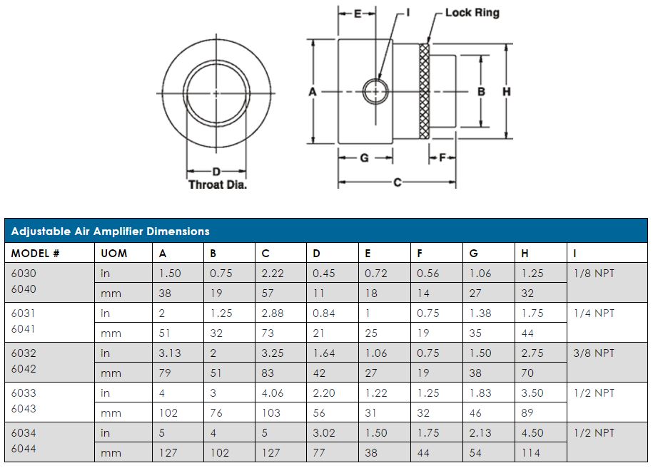 Force and flow for the Adjustable Air Amplifier is changed by turning the exhaust end (with the knurled ring loose) to open or close the continuous air gap. When desired performance is obtained, the knurled ring can be tightened to lock the flow at that setting.