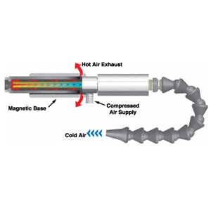 A new solution to an old problem. Heat build up on dry machining operations reduces tool life and machining rates. The Cold Gun Aircoolant System produces a stream of clean cold air at 50°F (28°C) below supply air temperature. Operation is a quiet 70 dBA and there are no moving parts to wear out. It will remove heat to prolong tool life and increase productivity on machining operations when liquid coolants cannot be used.