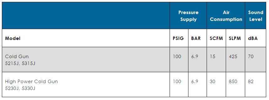EXAIR’s Cold Gun is non-adjustable to prevent freeze-up during use. Cold airflow and temperature drop are factory set to optimize the gun’s cooling capability.