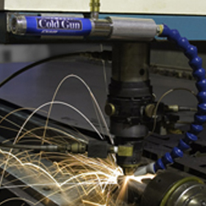 Cold air cools a laser cut part so it can be handled seconds later. The High Power Cold Gun has twice the cooling capacity of the standard Cold Gun, cooling the part in less time.