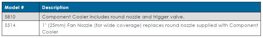 A trigger valve in the handle allows intermittent use. The Component Cooler is quiet (70 dBA) and has no moving parts, assuring years of maintenance free service. Payback period, in saved aerosol costs, is often measured in weeks.