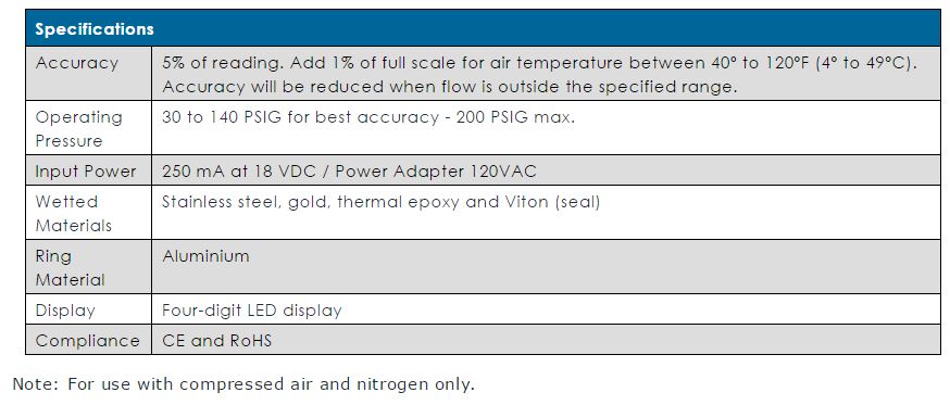 The Digital Flowmeter has an LED display that directly indicates the SCFM of airflow through that pipe (other flow meters require the reading to be multiplied by a specific conversion factor to be accurate). Two models are available for use on Schedule 40 iron pipe – one designed for 1″ Schedule 40 iron pipe and the other for 2″. Each Digital Flowmeter is calibrated for the specific pipe size it is mounted to.