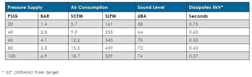 It requires only 10 PSIG (0.7 BAR) for most applications. The compact design saves bench space and allows mounting in confined areas. The sturdy stand is predrilled and can be bench, wall or machine mounted. It incorporates a swivel adjustment for directing the airflow.