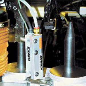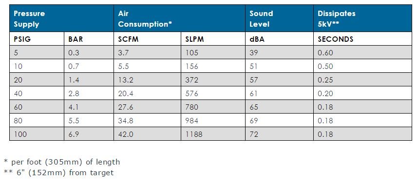 When air consumption and noise level are not critical to the application, the lower cost makes the Standard Ion Air Knife a good choice. (To compare the Super Ion Air Knife and Standard Ion Air Knife, see the performance table on the Super Ion Air Knife page and the performance table for the Standard Ion Air Knife, below.)