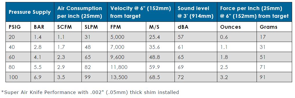 Noisy blowoffs become a whisper when replaced with the compact Super Air Knife. Even at high pressures of 80 PSIG (5.5 BAR), the sound level is surprisingly quiet at 69 dBA for most applications! Amplification ratios (entrained air to compressed air) of 40:1 are produced. The Super Air Knife meets OSHA dead-ended pressure and noise requirements.