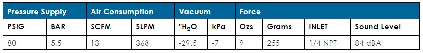 The Vac-u-Gun uses less compressed air than an ordinary blow gun. It injects a small amount of compressed air through directed nozzles to produce a vacuum on one end and a high output flow on the other. The amplified output flow is 12 times the air consumption rate.